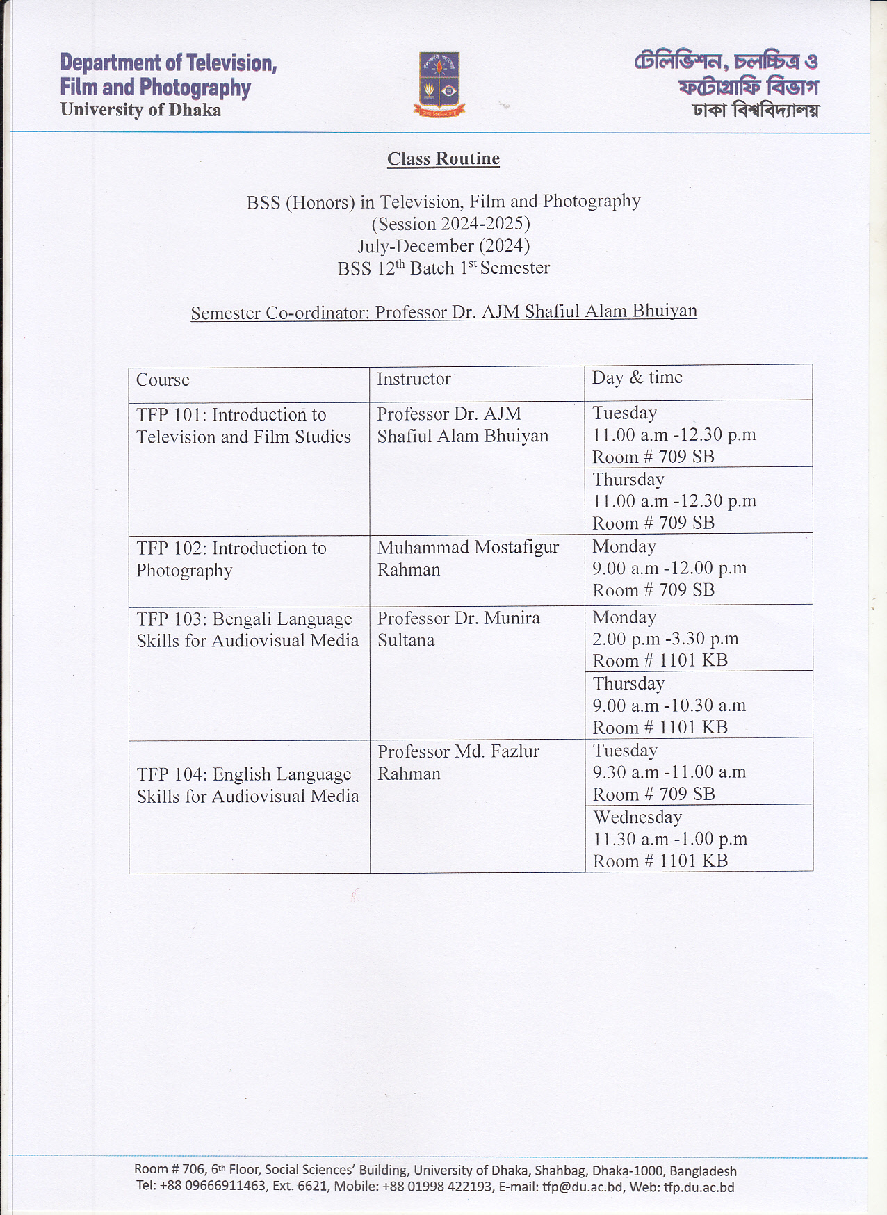 সংশোধিত ক্লাস রুটিন: বিএসএস ১২তম ব্যাচ ১ম সেমিস্টার