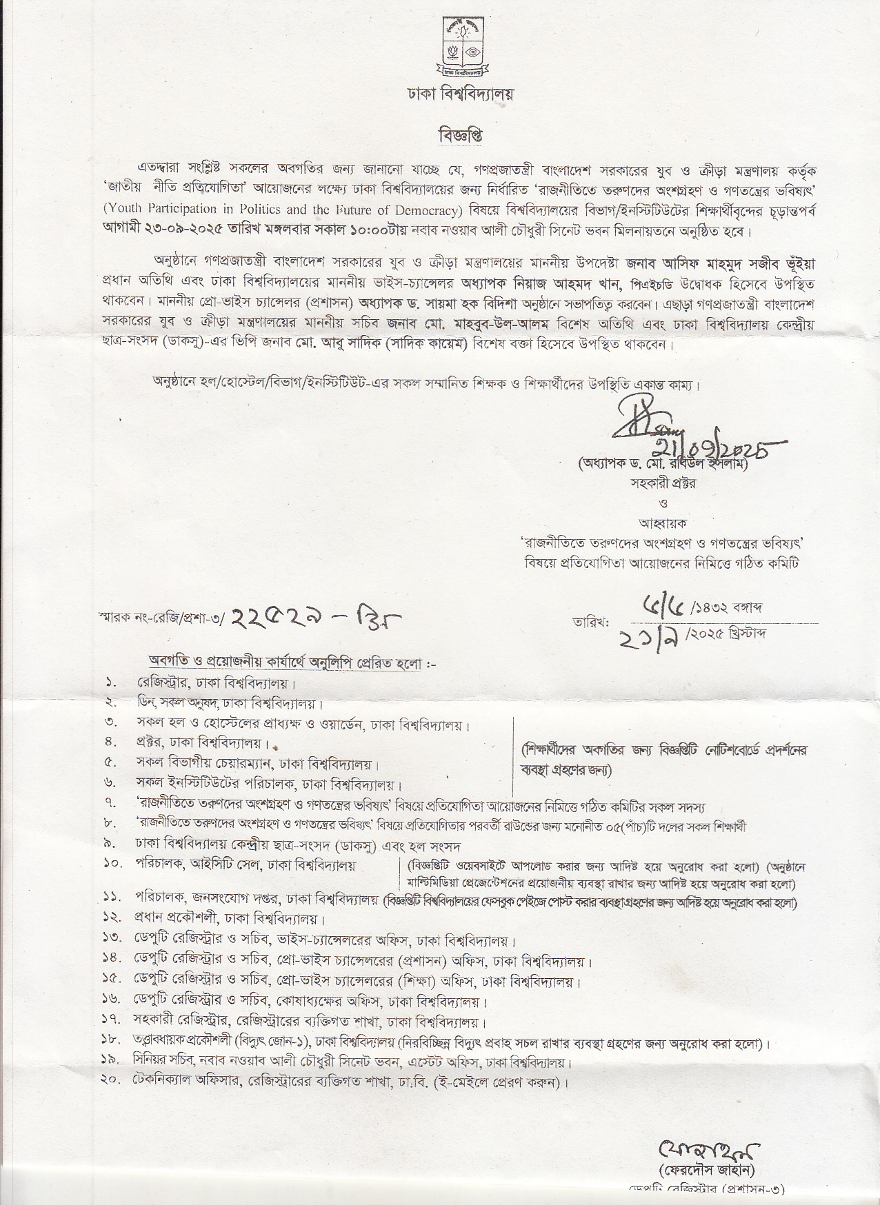 সংশোধিত বিজ্ঞপ্তি: ডাকসু ও হল সংসদ নির্বাচন ২০২৫ উপলক্ষে ক্লাশ ও পরীক্ষা বন্ধ প্রসঙ্গে
