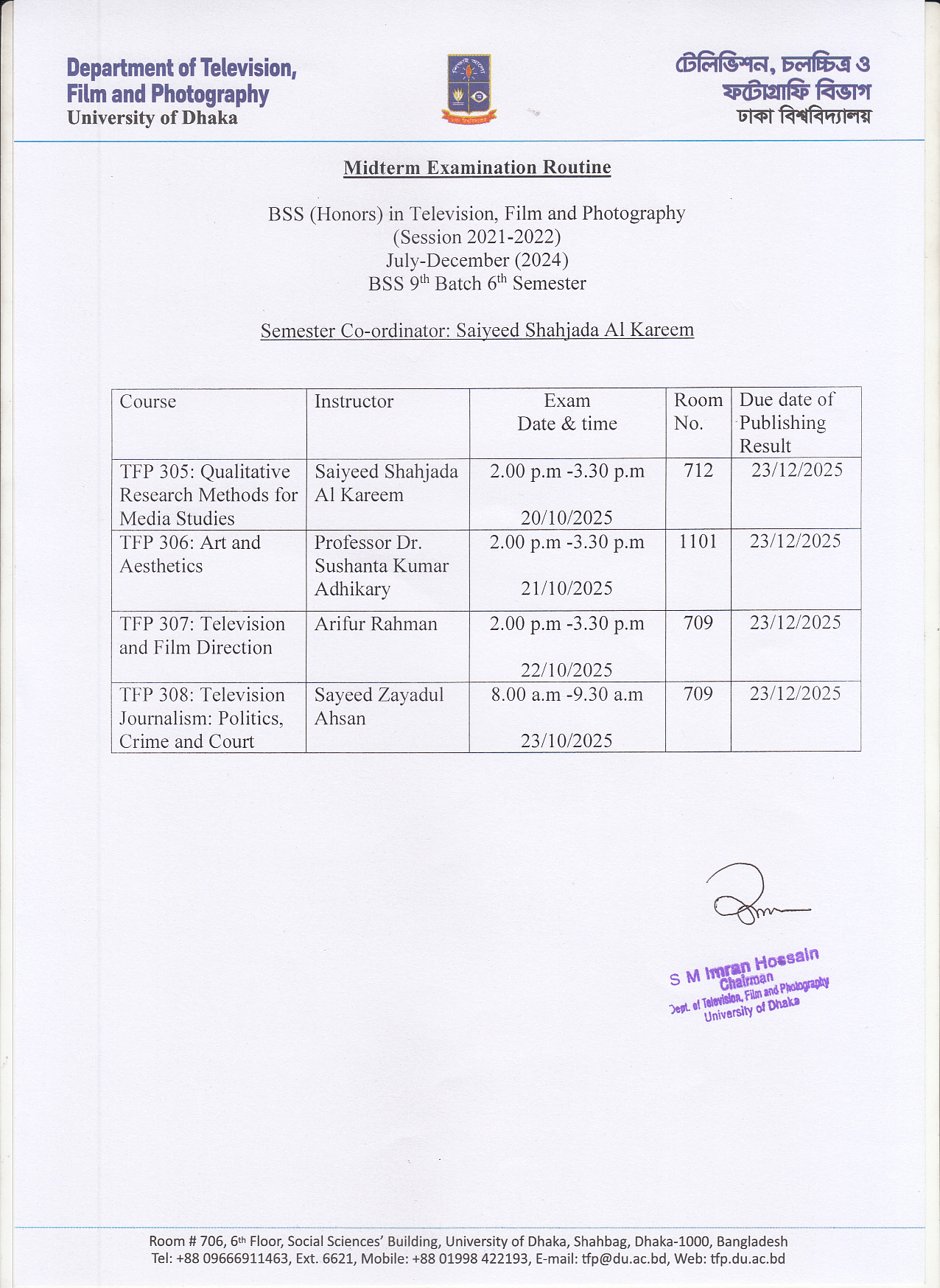 মিডটার্ম পরীক্ষার রুটিন: বিএসএস ৯ম ব্যাচ ৬ষ্ঠ সেমিস্টার, বিএসএস ১০ম ব্যাচ ৪র্থ সেমিস্টার