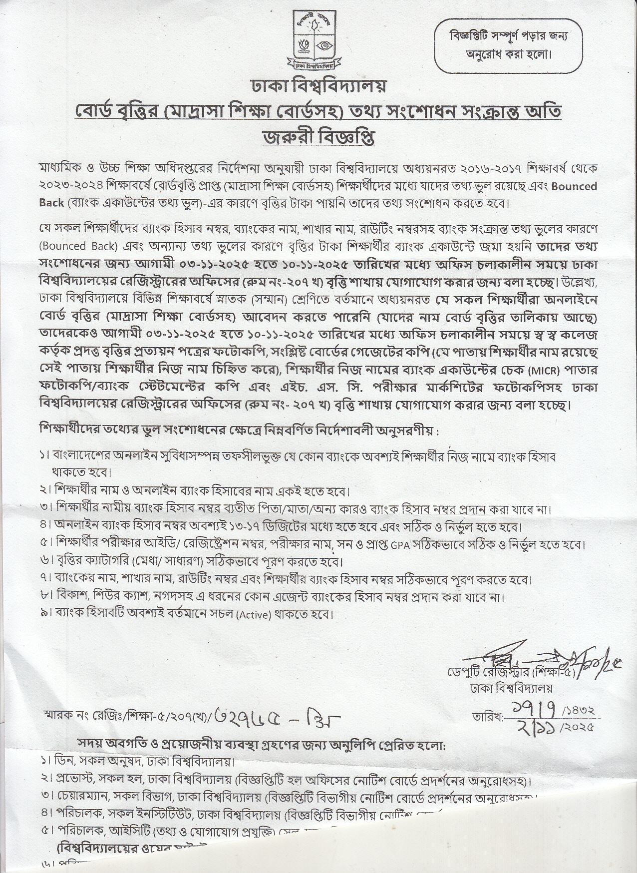 বোর্ড বৃত্তি (মাদ্রাসা শিক্ষা বোর্ডসহ) তথ্য সংশোধন সংক্রান্ত অতি জরুরি বিজ্ঞপ্তি